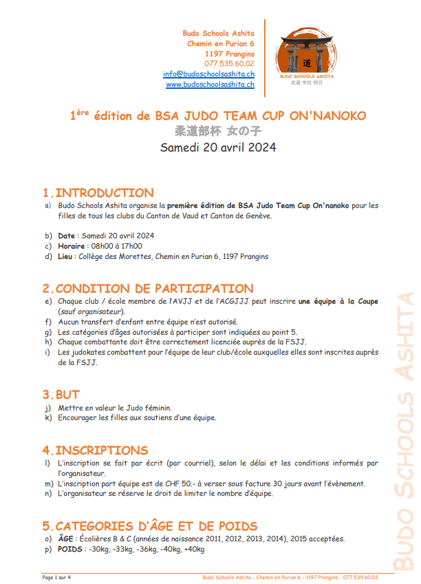 Budo Schools Ashita organise la première édition de BSA Judo Team Cup On’nanoko pour lesfilles de tous les clubs du Canton de Vaud et Canton de Genève.